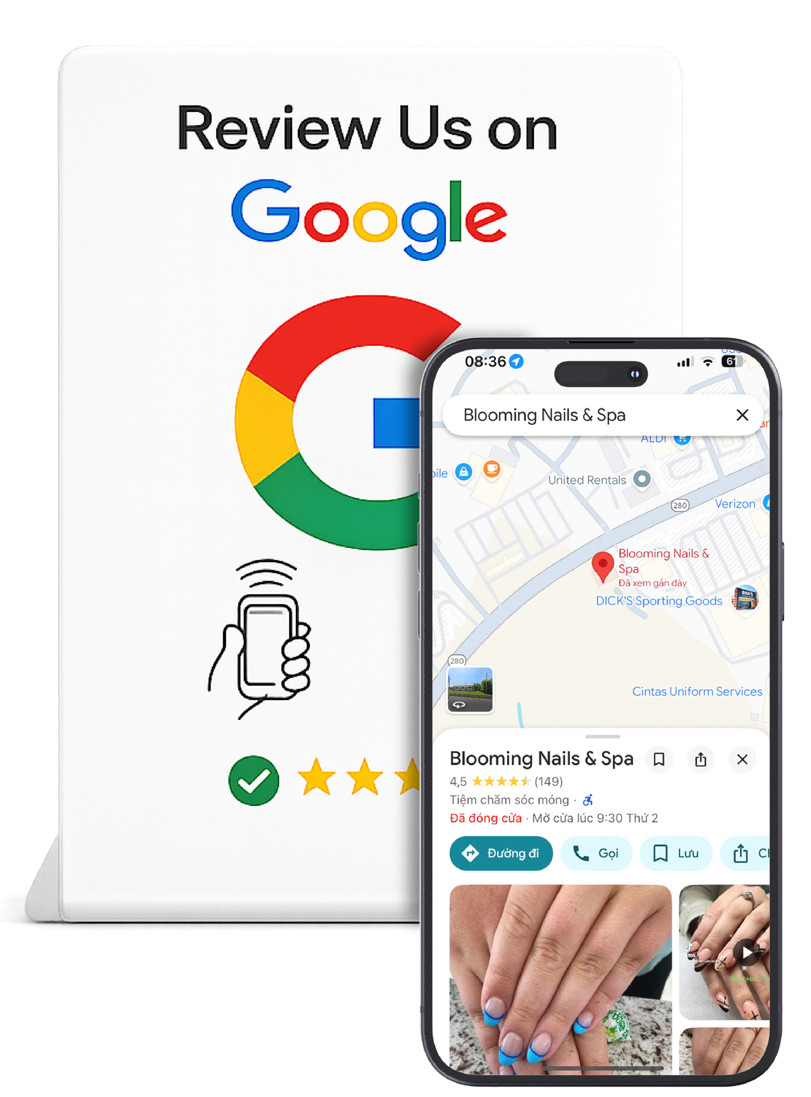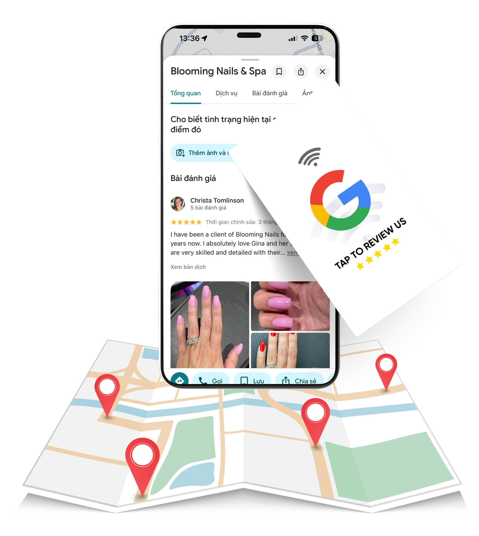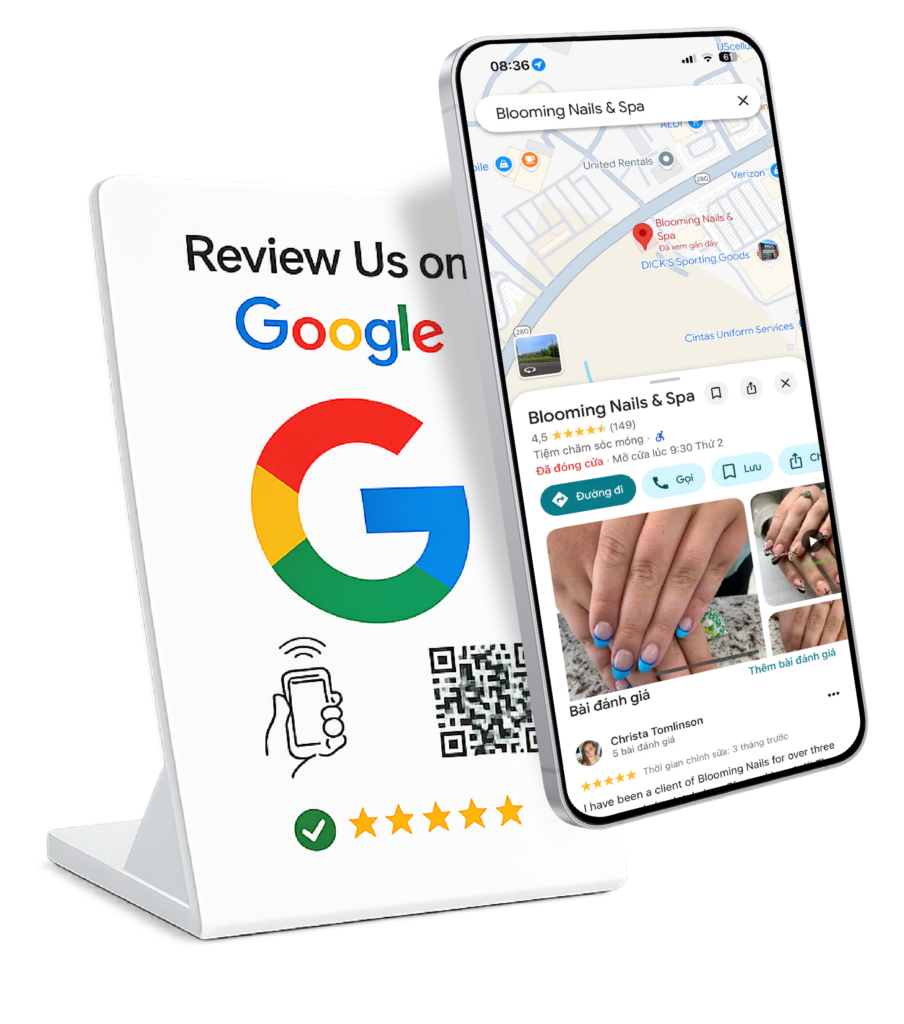 Khách hài lòng → chạm thẻ → để lại review ngay. Giải pháp đơn giản giúp salon tăng review thần tốc, nâng uy tín Google Maps và thu hút khách mới mỗi ngày ✨